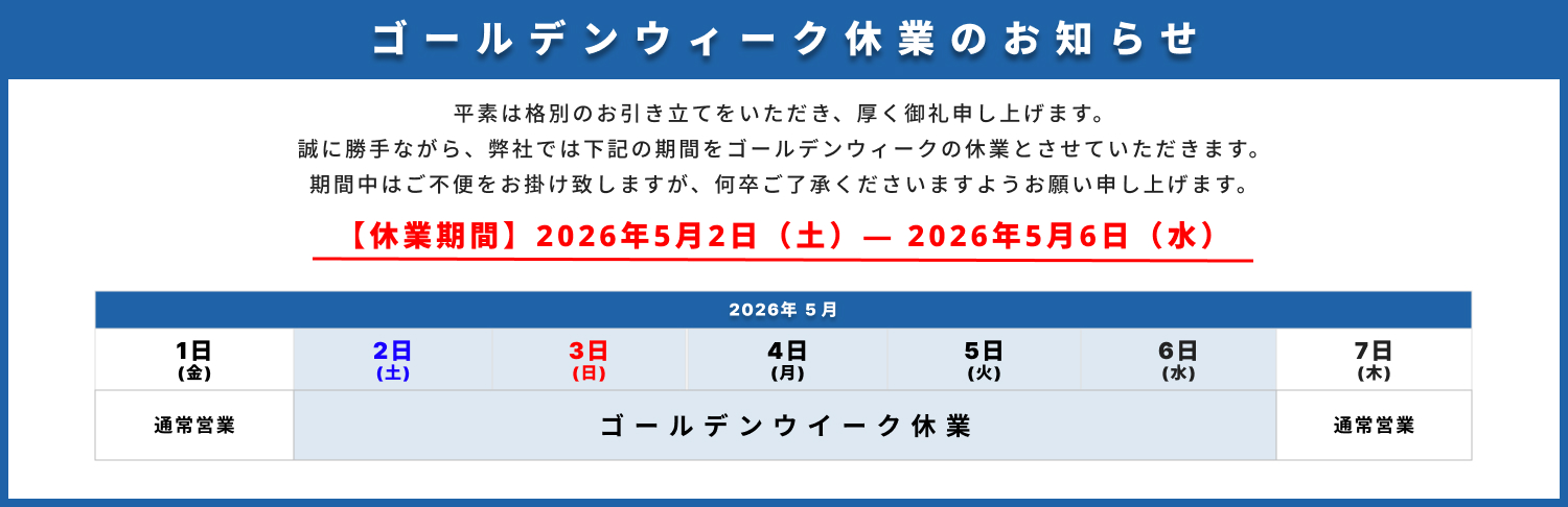 2026年5月2日(土) ~ 5月6日(水)の期間をゴールデンウィーク休業とさせていただきます。